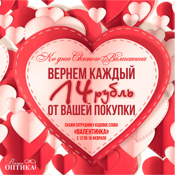 Мы с удовольствием объявляем о нашей акции в преддверии Дня святого Валентина! Только в ближайшие 5 дней вы получаете возможность вернуть себе каждый 14 рубль от покупки в наших оптиках. Для этого всего лишь назови нашему специалисту кодовое слово «Валентинка» и выбирай товары или услуги на свой вкус! Поздравляем всех с наступающим праздником, будьте искренними, любите, проявляйте заботу и будьте счастливы! Подробности акции вы можете получить у наших специалистов или прочитать ниже: Акция проводится в период с 12 по 16 февраля 2019 года в сети оптик «Ваша Оптика» по адресам, указанным на сайте optiki34.ru. В акции может принять любой совершеннолетний гражданин РФ. Каждый 14 рубль от суммы покупки возвращается покупателю путем предоставления скидки на эту покупку в размере 8% от полной суммы покупки (товаров и услуг, реализуемых в салонах). Для получения скидки, покупателю необходимо произнести кодовое слово «Валентинка» для сотрудника салона. Акция не распространяется на все акционные предложения, подарочные сертификаты и не суммируется со скидками по дисконтной карте.