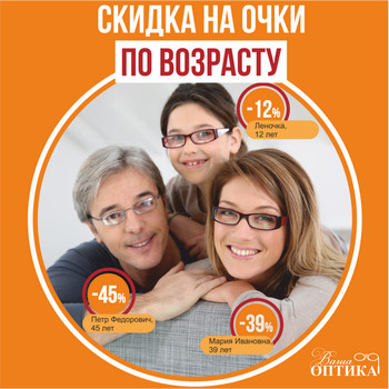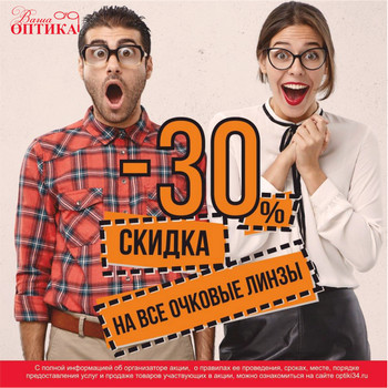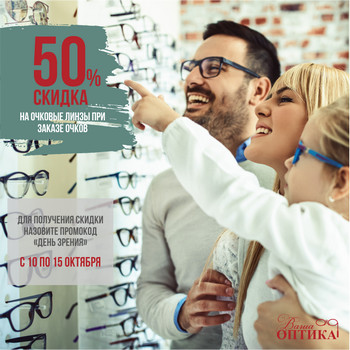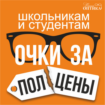 Акция «Скидка на изготовление очков для студентов и школьников» проводится во всех салонах оптик «Ваша Оптика», по адресам, указанным на сайте www.optiki34.ru в период с 10 сентября по 15 октября 2018 года. Размер скидки по данной акции - 30% от стоимости товаров или услуг для школьников или студентов. Предложение действует на следующие виды товаров и услуг: оправа, линзы, изготовление очков. Проверка зрения и подбор линз в рамках акции производится бесплатно. Для категории покупателей, возрастом до 17 лет, изготовление очков производится строго по рецепту. Скидки по дисконтным картам и специальные предложения не суммируются с данной акцией.