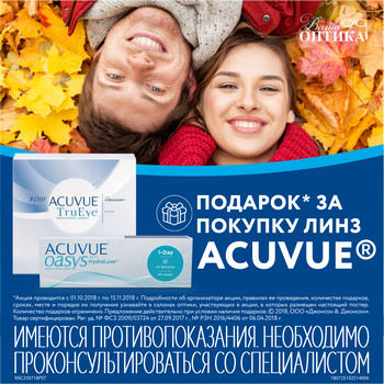 У нас вновь есть повод порадовать наших клиентов! И с радостью объявляем, что до 15 ноября в наших салонах проходит акция: при покупке 2х стандартных упаковок линз Acuvue или любой большой упаковки вы получаете один из замечательных подарков – дорожную косметичку Acuvue или набор «чехлы для одежды в чемодан Acuvue»! Подробности о подарках и прочих условиях акции - в наших оптиках