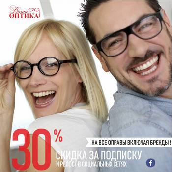 Получить скидку легко: подпишитесь на официальную страничку сети салонов "Ваша Оптика", отметьте публикацию как понравившуюся и поделитесь с друзьями, а в момент покупки покажите действия на странице нашему продавцу консультанту. Ждем вас в наших салонах!