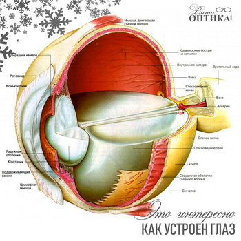 Вы наверняка отметили, что рубрика «про термины» выходит постоянно на нашей страничке, в которой мы касаемся тем, связанных со здоровьем и функционированием наших глаз. В ней мы неоднократно упоминали, что глаз — это сложная система из многих «составляющих». Но вот где какой элемент этой системы находится и как это все выглядит «изнутри»? Мы решили сегодня поделиться с вами этим рисунком строения глаза. И поверьте – это не самая сложная схема, графически изображающая этот орган, специалисты подтвердят!